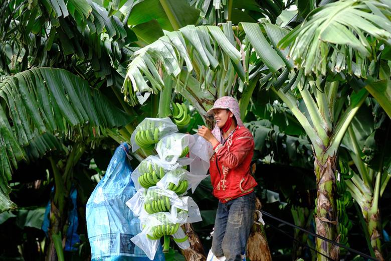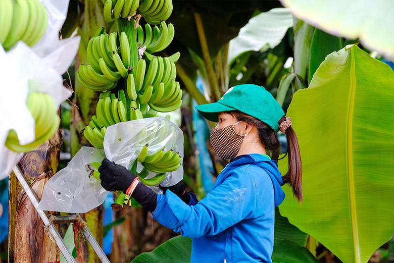 Công nhân tỉ mỉ chăm sóc từng buồng chuối.